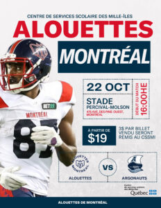 Partenaire du CSSMI, le club montréalais les Alouettes de Montréal offrent des billets à prix réduit à la communauté CSSMI. Venez applaudir nos deux élèves boursiers lors de ce dernier match de la saison à domicile.