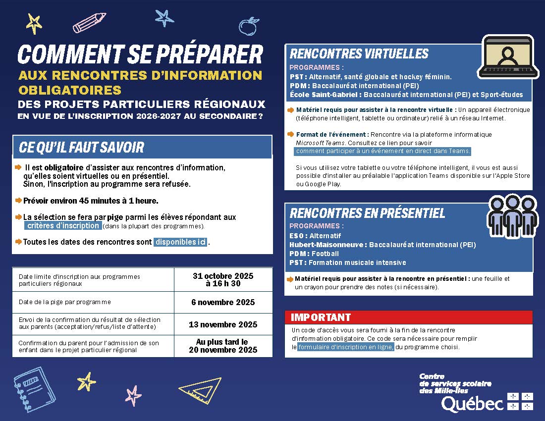 En vue de l’inscription 2026-2027 au secondaire, des soirées d’information sont obligatoires pour les élèves de 6e année, désireux de s’inscrire à des projets particuliers régionaux.